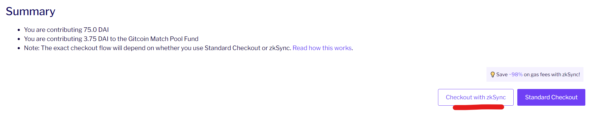 Donate around 5 $DAI/$USDT to each project. Set give back percentage to 5% and untick “Hide my wallet address”. Choose to check out with zkSync.
