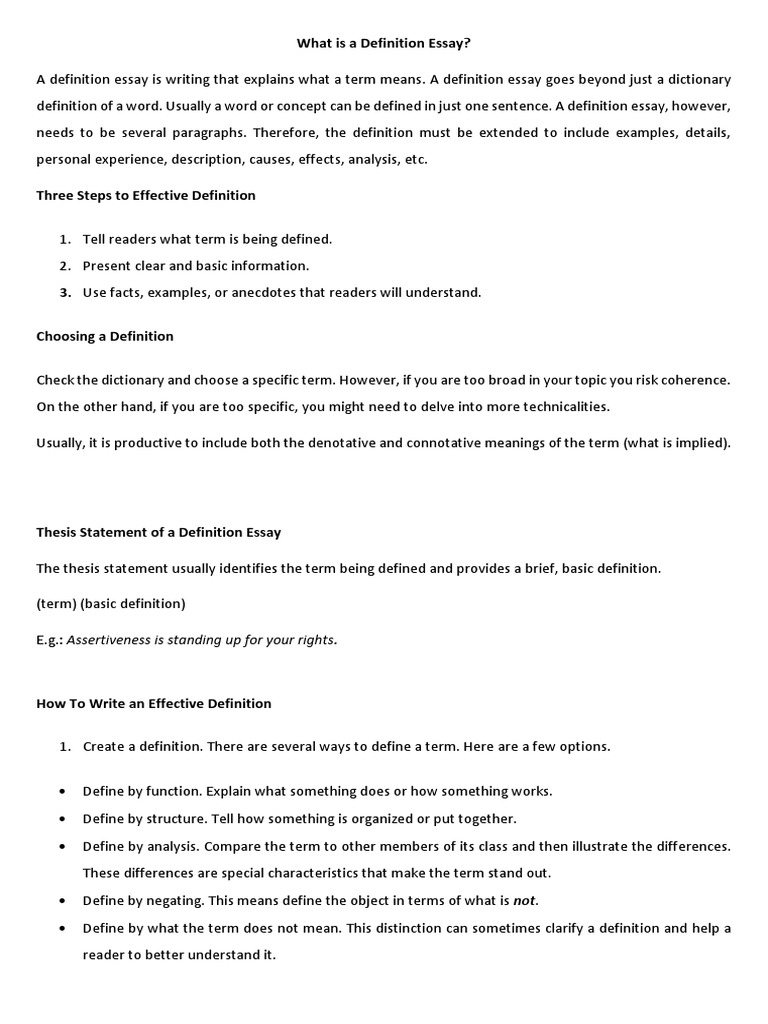 Definition Essay Examples and Topic Ideas . A formal definition essay defines a term or concept . Definition essays are a form of expository writing in which the writer provides information about the term to their audience . They typically follow a standard essay format and include both a definition and an analysis of the term .