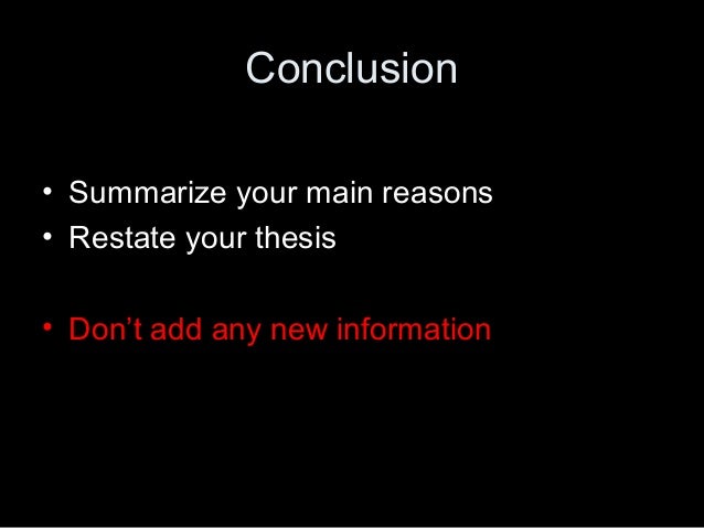 Your essay conclusion is about summarizing the thesis and statements . Don't share personal thoughts unless you write a first-person opinion piece . Don't restate each and all the details . You have body paragraphs for that . Don't just restate the thesis if you can provide some further . . . State a Thesis β§ How to Write a Rhetorical Precis Your Professor Will Never Forget β§ Essay Hook β§ Persuasive Essays β§ Thesis Statement Generator β§ Study Archives