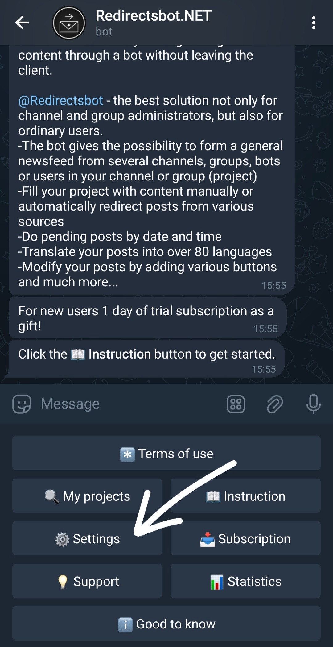 Send the bot the phone number of the account that is subscribed to the sources from which you plan to redirect posts to your projects.