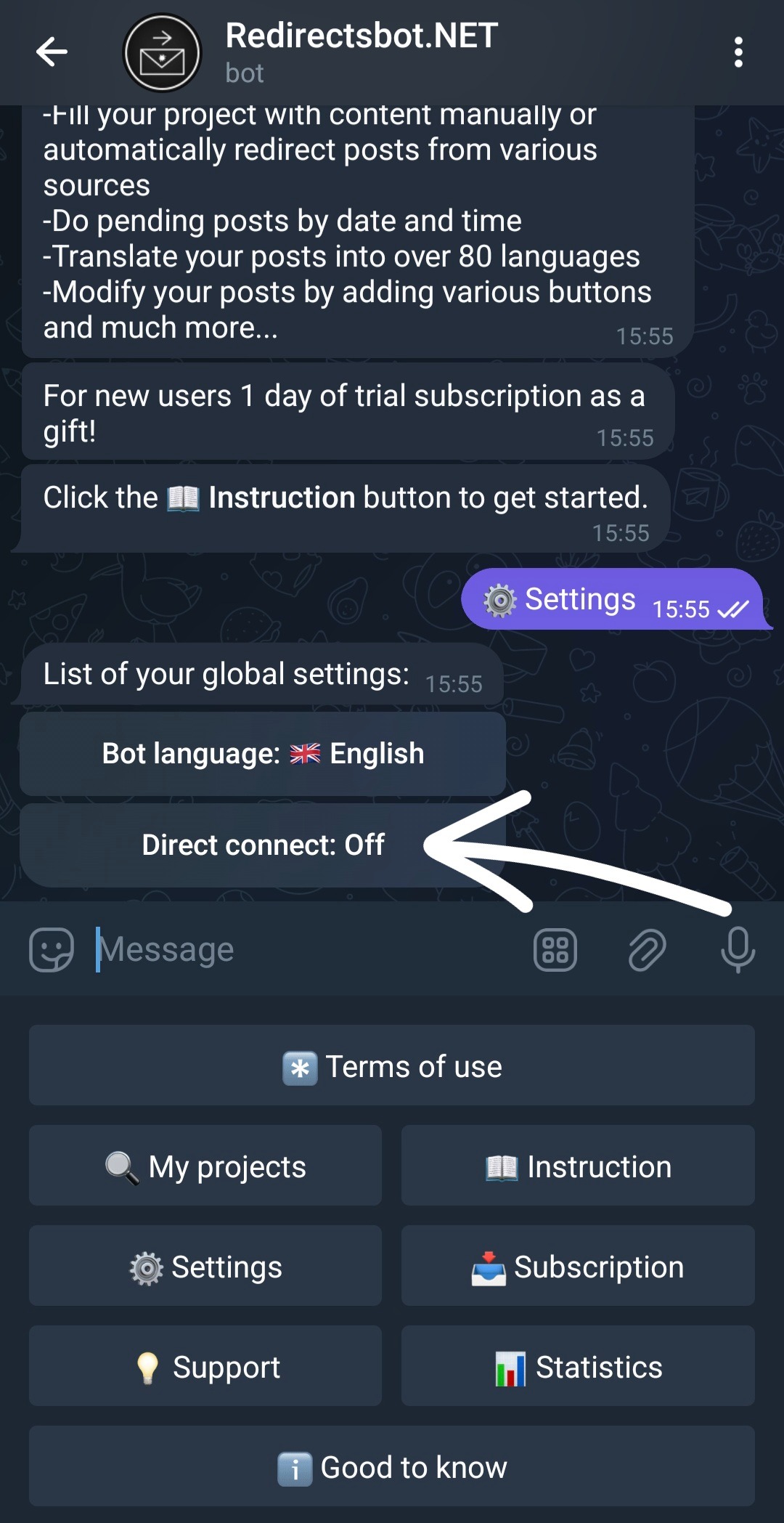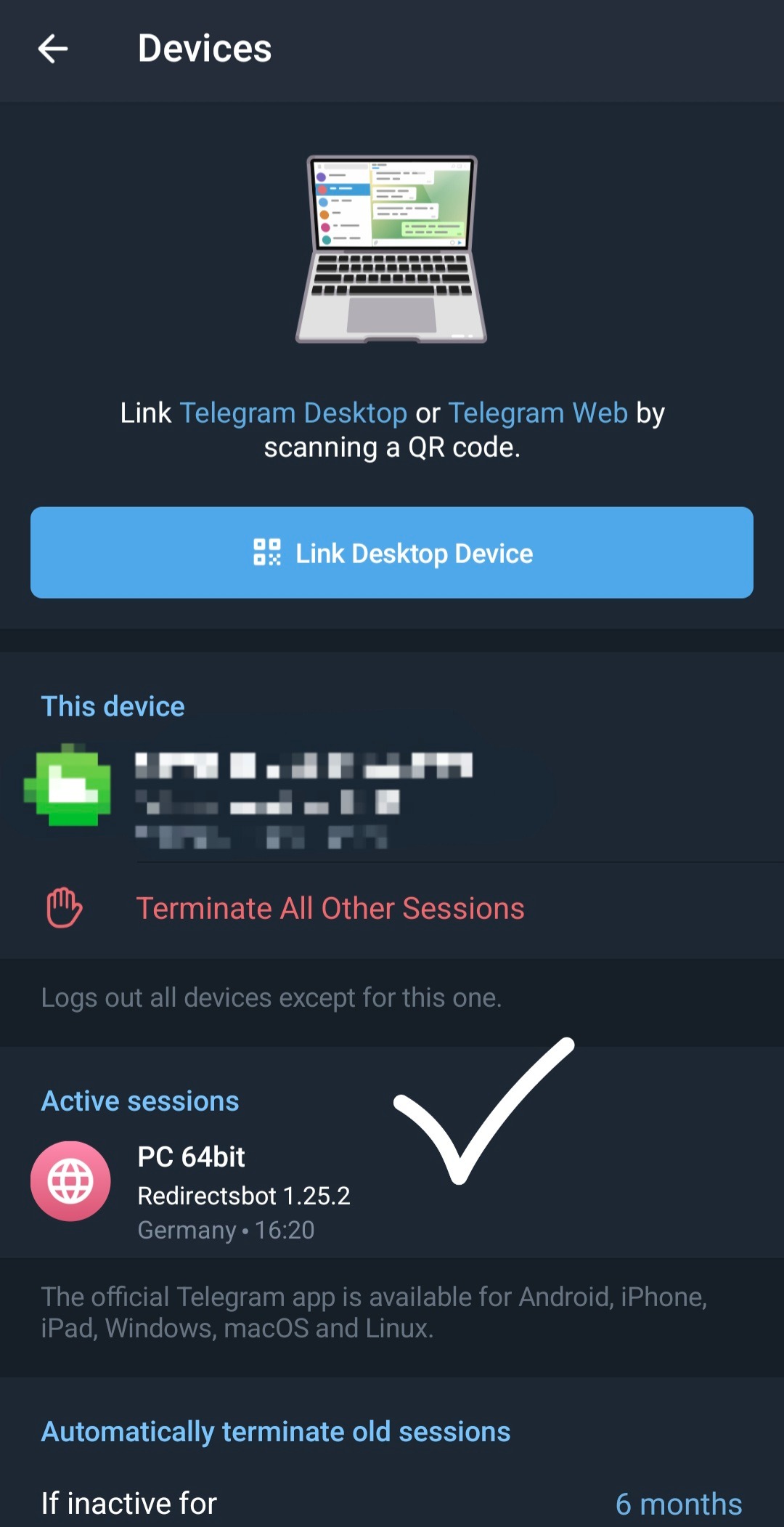 If there is Redirectsbot in active sessions, then the account is connected successfully, you only need to add sources and wait 30-40 minutes from the moment of connection of the direct connection account and all new posts from sources will be redirected to your project. If there is no active session or it is incomplete, then in the bot settings disconnect the account and reconnect carefully following the instructions until you receive a notification of successful login or an active session appears.