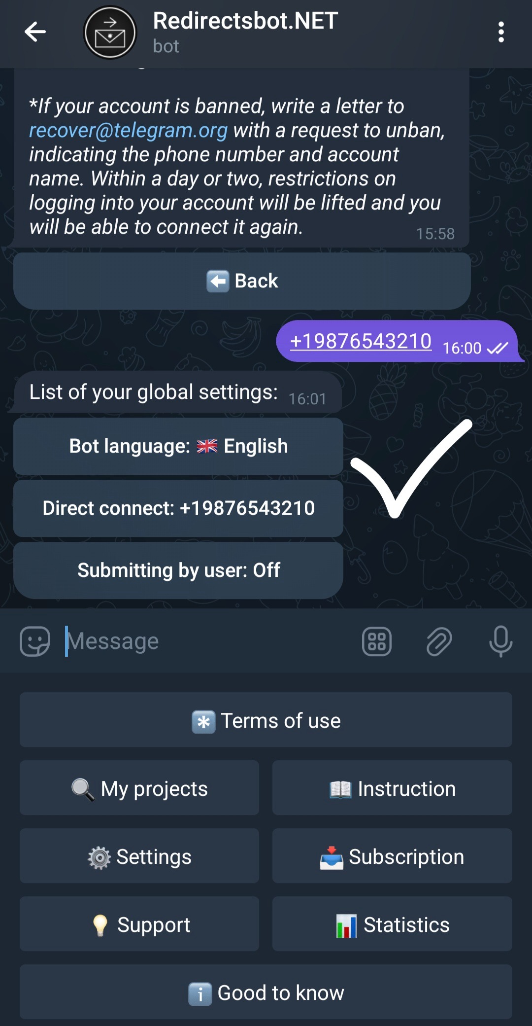 The connected number will be displayed in the direct connection button, but it is important that you also receive a message from Telegram that you have successfully logged into your account.