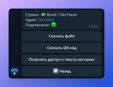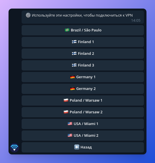 Как только платеж будет подтвержден, вы получите уведомление в боте Telegram, и сервис будет автоматически активирован, вы получите настройки для каждой локации VPN.
