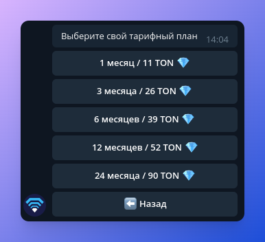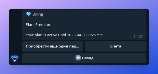 Когда время вашего тарифного плана истечёт, настройки VPN вашей учётной записи автоматически отключатся, и вы потеряете VPN-подключение. Чтобы избежать этого, вы можете в любое время приобрести дополнительное время и добавить его к вашему тарифному плану. Не волнуйтесь, бот своевременно предупредит вас, отправив уведомление до истечения срока действия вашего тарифного плана.