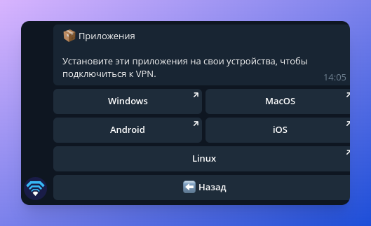 Вы можете запустить команду /apps чтобы увидеть меню приложений. Первый шаг — установить приложение на ваше устройство в соответствии с его операционной системой.
