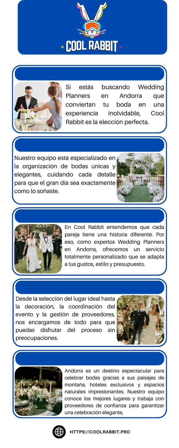 Si estás buscando Wedding Planners en Andorra que conviertan tu boda en una experiencia inolvidable, Cool Rabbit es la elección perfecta. Nuestro equipo está especializado en la organización de bodas únicas y elegantes, cuidando cada detalle para que el gran día sea exactamente como lo soñaste.