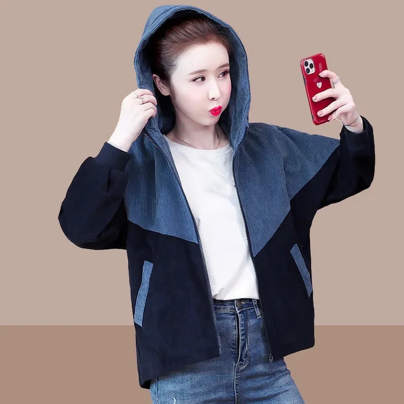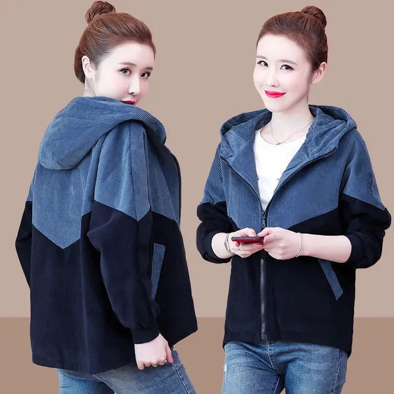 "Corduroy Stitching Jacket Women's 2022 Spring Autumn New Korean Version Slimming All-Match Color Matching Hooded Loose Coat M252" * Buy Now Just For 17$
