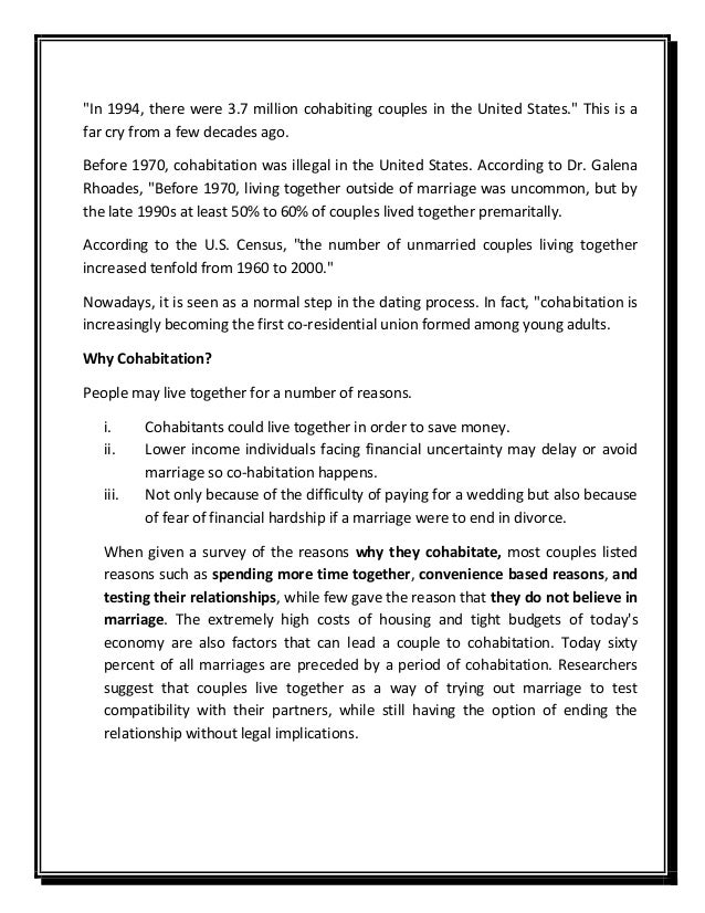 Dating represents an important stage in the lives of adolescents and young adults . Specifically, . . . While the prevalence of cohabitation has increased, the median age at which men and women first form a coresidential union—either marriage or cohabitation—has not changed much over time .