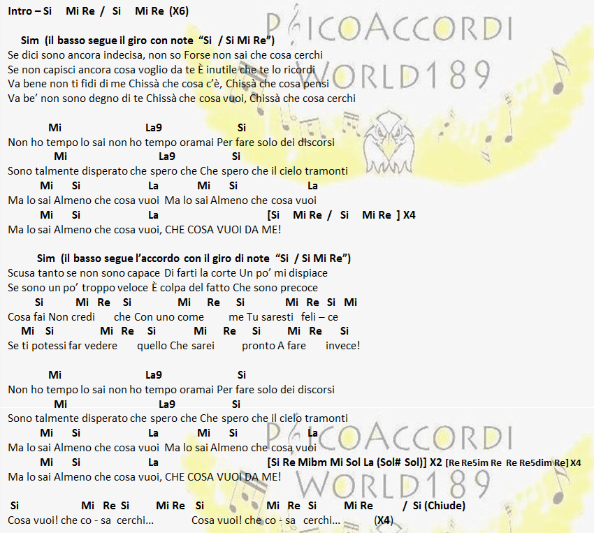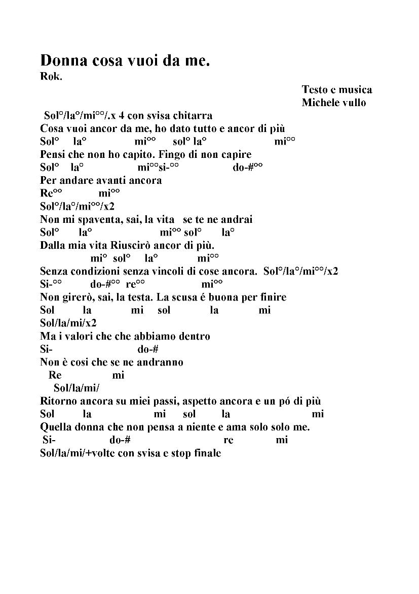 Cosa vuoi da me? Lyrics: Cosa vuoi da me? / Cosa vuoi sapere? / La colpa non è mia, non è mia questo lo sai bene / Noi non possiamo stare insieme, anche se mi chiedi da bere / Questa volta no . . .