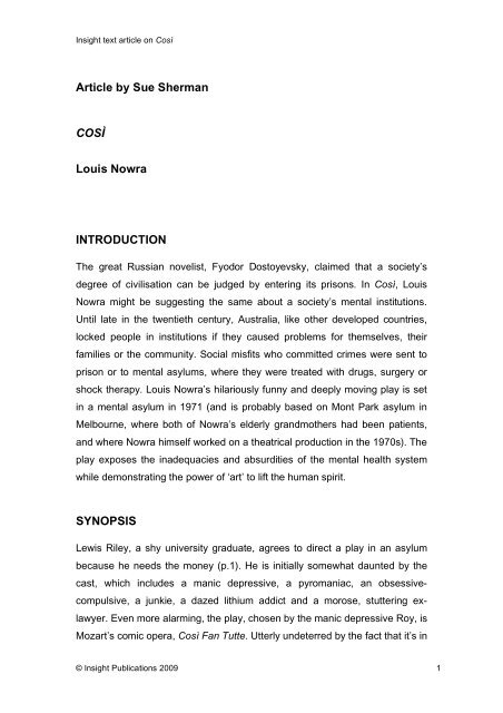 " Cosi " by Louis Nowra Argumentative Essay on Blalawriting .com π₯ - In the play Cosi by Louis Nowra , recent university graduate Lewis Riley takes on a group of asylum patients and sets out to perform a play to earn some