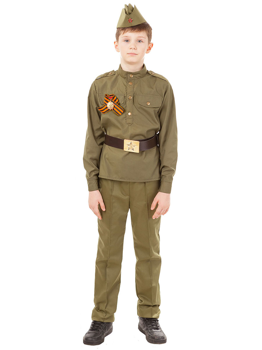Cette image est une copie exacte de l'uniforme d'un soldat de l'Armée rouge. Une large gamme de tailles rend ce costume adapté aux garçons de presque tous les âges. Ce costume est parfait non seulement pour célébrer le Jour de la Victoire, mais aussi pour le Nouvel An et le 23 février. Peut également être utilisé comme costume pour des spectacles et des représentations. Caractéristiques : Tunique ample à manches longues Boutons dorés au col Poches décoratives Ruban Saint-Georges et Commande incluse Boucle de ceinture avec étoile Pantalon droit avec flèches Casquette avec badge Caractéristiques : Tissu : diagonal Hauteur : 98 - 158 Tailles : 26 - 42 Fabricant : Pugovka, Russie