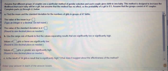 Assume that different groups of couples use a particular method of gender selection and each couple gives birth to one baby . This method is designed to increase the likelihood that each baby will be a girl, but assume that the method has no effect, so the probability of a girl is 0 .5 . Assume that the groups consist of 28 couples .