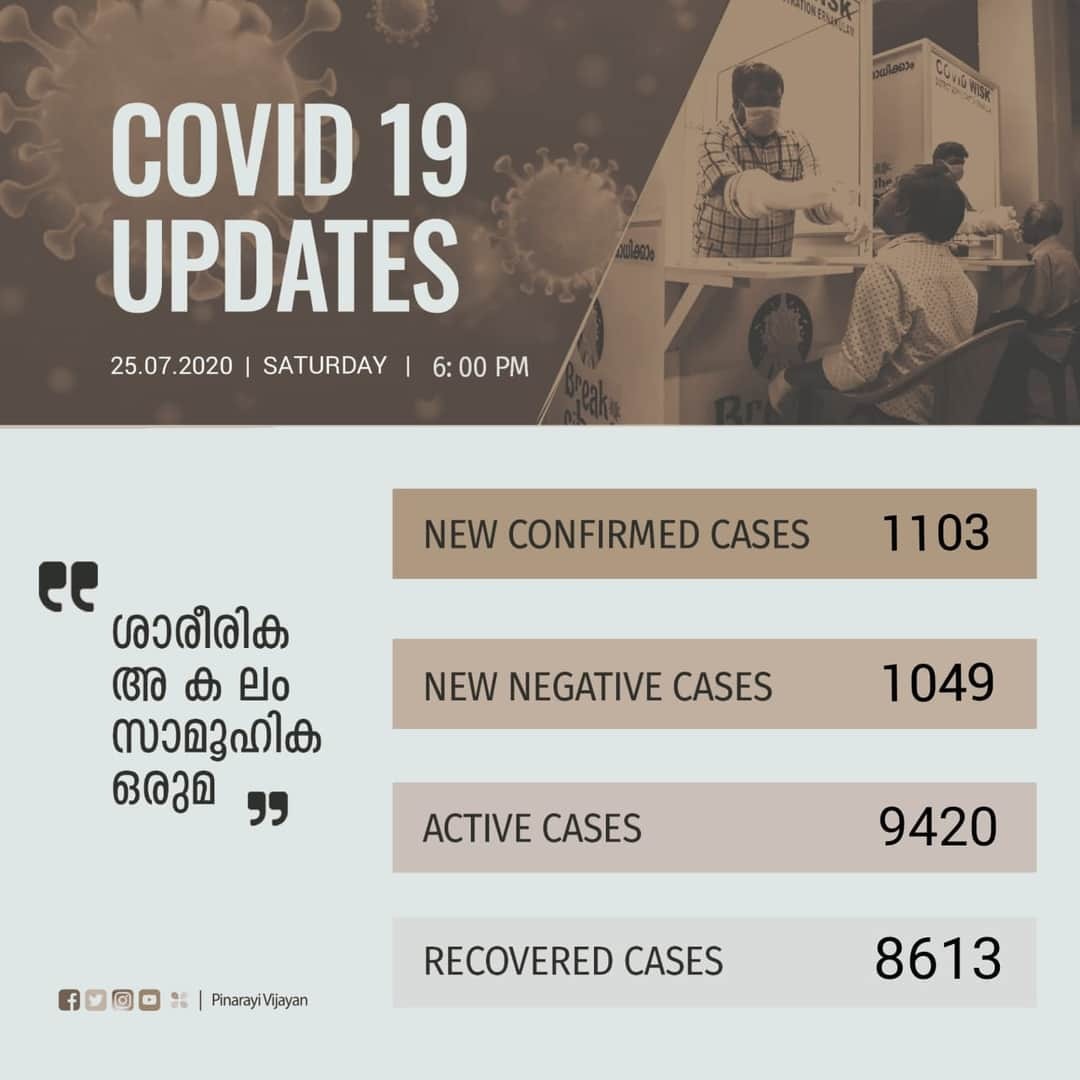 സംസ്ഥാനത്ത് ഇന്ന് 1103 പേര്ക്ക് കോവിഡ്-19 സ്ഥിരീകരിച്ചു. തിരുവനന്തപുരം ജില്ലയില് 240 പേര് രോഗബാധിതരായി. കോഴിക്കോട് ജില്ലയില് 110 പേര്ക്കും, കാസര്ഗോഡ് ജില്ലയില് 105 പേര്ക്കും, ആലപ്പുഴ ജില്ലയില് 102 പേര്ക്കും, കൊല്ലം ജില്ലയില് 80 പേര്ക്കും, എറണാകുളം ജില്ലയില് 79 (ഒരാള് മരണമടഞ്ഞു) പേര്ക്കും, കോട്ടയം ജില്ലയില് 77 പേര്ക്കും, മലപ്പുറം ജില്ലയില് 68 പേര്ക്കും, കണ്ണൂര് ജില്ലയില് 62 പേര്ക്കും, പത്തനംതിട്ട ജില്ലയിൽ 52 പേര്ക്കും, ഇടുക്കി ജില്ലയില് 40 പേര്ക്കും, തൃശൂര് ജില്ലയില് 36 പേര്ക്കും, പാലക്കാട് ജില്ലയില് 35 പേര്ക്കും, വയനാട് ജില്ലയില് 17 പേര്ക്കുമാണ് ഇന്ന് രോഗ ബാധ സ്ഥിരീകരിച്ചത്.