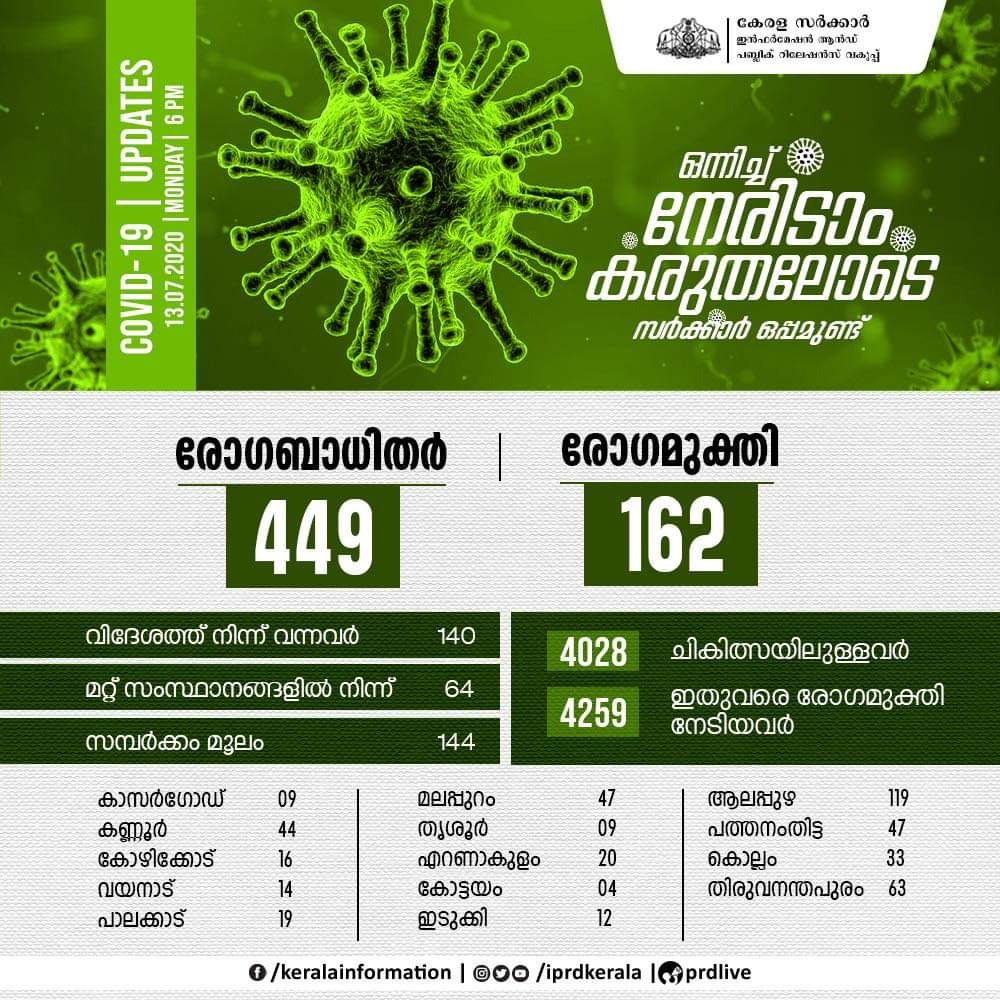 കേരളത്തില് ഇന്ന് 449 പേര്ക്ക് കോവിഡ്-19 സ്ഥിരീകരിച്ചു. ആലപ്പുഴ ജില്ലയില് നിന്നുള്ള 119 പേര്ക്കും, തിരുവനന്തപുരം ജില്ലയില് നിന്നുള്ള 63 പേര്ക്കും, പത്തനംതിട്ട, മലപ്പുറം ജില്ലകളില് നിന്നുള്ള 47 പേര്ക്ക് വീതവും, കണ്ണൂര് ജില്ലയില് നിന്നുള്ള 44 പേര്ക്കും, കൊല്ലം ജില്ലയില് നിന്നുള്ള 33 പേര്ക്കും, പാലക്കാട് ജില്ലയില് നിന്നുള്ള 19 പേര്ക്കും, കോഴിക്കോട് ജില്ലയില് നിന്നുള്ള 16 പേര്ക്കും, എറണാകുളം ജില്ലയില് നിന്നുള്ള 15 പേര്ക്കും, വയനാട് ജില്ലയില് നിന്നുള്ള 14 പേര്ക്കും, കോട്ടയം ജില്ലയില് നിന്നുള്ള 10 പേര്ക്കും, തൃശൂര്, കാസര്കോട് ജില്ലകളില് നിന്നുള്ള 9 പേര്ക്ക് വീതവും, ഇടുക്കി ജില്ലയില് നിന്നുള്ള 4 പേര്ക്കുമാണ് ഇന്ന് രോഗബാധ സ്ഥിരീകരിച്ചത്.