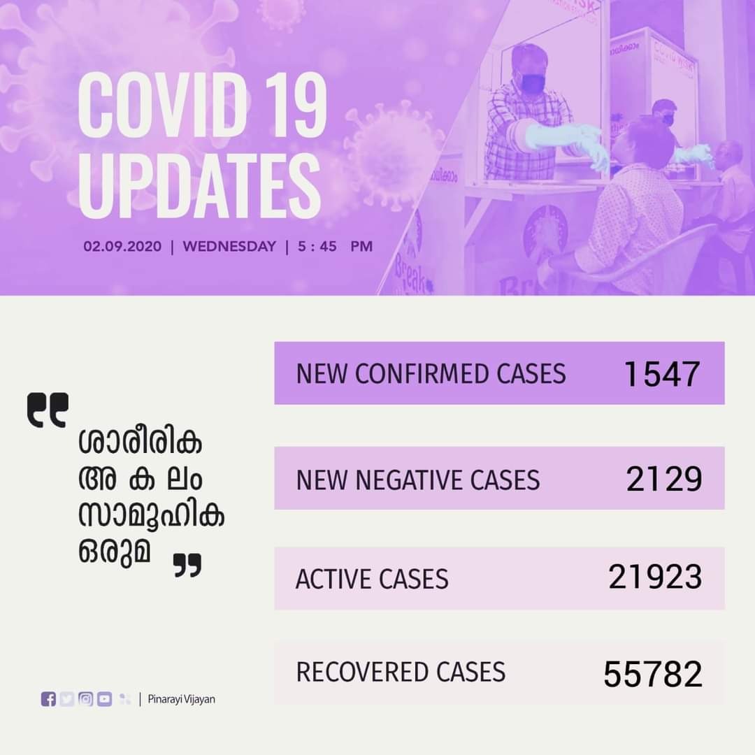 ഇന്ന് രോഗം സ്ഥിരീകരിച്ചവരില് 21 പേര് വിദേശ രാജ്യങ്ങളില് നിന്നും 65 പേര് മറ്റ് സംസ്ഥാനങ്ങളില് നിന്നും വന്നതാണ്. 1419 പേര്ക്ക് സമ്പര്ക്കത്തിലൂടെയാണ് രോഗം ബാധിച്ചത്. അതില് 156 പേരുടെ സമ്പര്ക്ക ഉറവിടം വ്യക്തമല്ല. തിരുവനന്തപുരം ജില്ലയില് നിന്നുള്ള 211 പേര്ക്കും, കോഴിക്കോട് ജില്ലയില് നിന്നുള്ള 196 പേര്ക്കും, കോട്ടയം ജില്ലയില് നിന്നുള്ള 143 പേര്ക്കും, മലപ്പുറം ജില്ലയില് നിന്നുള്ള 134 പേര്ക്കും, ആലപ്പുഴ ജില്ലയില് നിന്നുള്ള 131 പേര്ക്കും, എറണാകുളം ജില്ലയില് നിന്നുള്ള 122 പേര്ക്കും, കണ്ണൂര് ജില്ലയില് നിന്നുള്ള 121 പേര്ക്കും, തൃശൂര് ജില്ലയില് നിന്നുള്ള 116 പേര്ക്കും, കാസര്ഗോഡ് ജില്ലയില് നിന്നുള്ള 85 പേര്ക്കും, കൊല്ലം ജില്ലയില് നിന്നുള്ള 77 പേര്ക്കും, വയനാട് ജില്ലയില് നിന്നുള്ള 31 പേര്ക്കും, പാലക്കാട് ജില്ലയില് നിന്നുള്ള 24 പേര്ക്കും, പത്തനംതിട്ട ജില്ലയില് നിന്നുള്ള 16 പേര്ക്കും, ഇടുക്കി ജില്ലയില് നിന്നുള്ള 12 പേര്ക്കുമാണ് ഇന്ന് സമ്പര്ക്കത്തിലൂടെ രോഗം ബാധിച്ചത്.