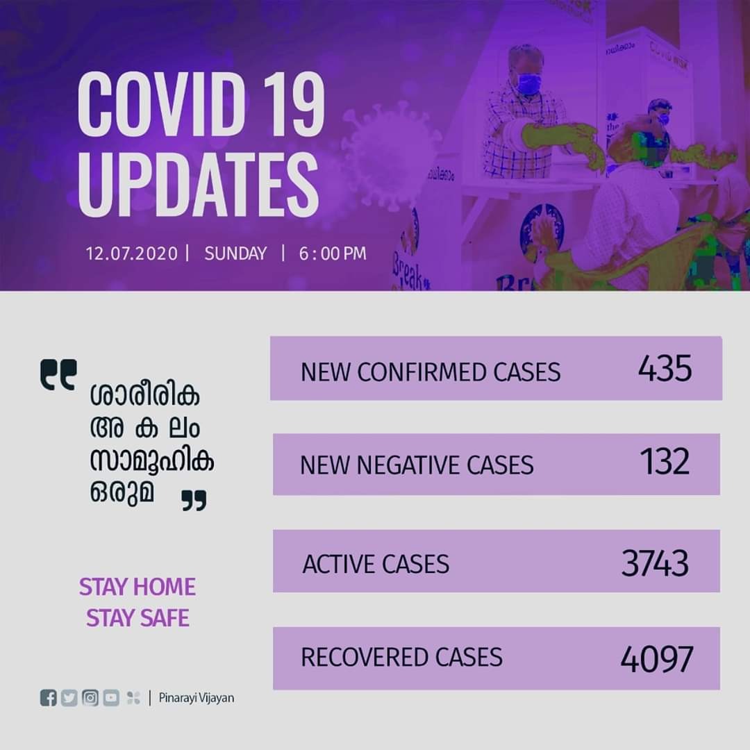 രോഗം സ്ഥിരീകരിച്ച് ചികിത്സയിലായിരുന്ന 132 പേരുടെ പരിശോധനാഫലം നെഗറ്റീവ് ആയി. പത്തനംതിട്ട ജില്ലയില് നിന്നുള്ള 24 പേരുടെയും, കണ്ണൂര് ജില്ലയില് നിന്നുള്ള 22 പേരുടെയും (മലപ്പുറം 1, കാസര്ഗോഡ് 1, കോഴിക്കോട് 1), തൃശൂര് ജില്ലയില് നിന്നുള്ള 20 പേരുടെയും, കോഴിക്കോട് ജില്ലയില് നിന്നുള്ള 18 പേരുടെയും (എറണാകുളം 1), പാലക്കാട് ജില്ലയില് നിന്നുള്ള 16 പേരുടെയും, മലപ്പുറം ജില്ലയില് നിന്നുള്ള 15 പേരുടെയും, കാസര്കോട് ജില്ലയില് നിന്നുള്ള 7 പേരുടെയും, എറണാകുളം ജില്ലയില് നിന്നുള്ള 5 പേരുടെയും തിരുവനന്തപുരം ജില്ലയില് നിന്നുള്ള 3 പേരുടെയും (പത്തനംതിട്ട 1), ആലപ്പുഴ, കോട്ടയം ജില്ലകളില് നിന്നുള്ള ഓരോരുത്തരുടെ വീതവും പരിശോധനാഫലം ആണ് ഇന്ന് നെഗറ്റീവ് ആയത്. ഇതോടെ 3743 പേരാണ് രോഗം സ്ഥിരീകരിച്ച് ഇനി ചികിത്സയിലുള്ളത്. 4097 പേര് ഇതുവരെ കോവിഡില് നിന്നും മുക്തി നേടി.
