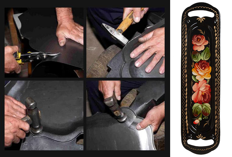Основным мотивом промысла, история которого восходит к началу XIX века, является цветочный букет. В росписи не используются образцы или трафареты. Исторически, само производство жостовских подносов происходило вручную (холодная выколотка). Мастер-коваль вырезал ножницами по металлу форму будущего подноса и специальными молотками выколачивал его борт.