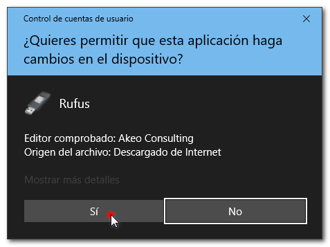 Al ejecutar Rufus le aparece el aviso de Control de cuentas de usuario (UAC) y se le indica permitir (SI).