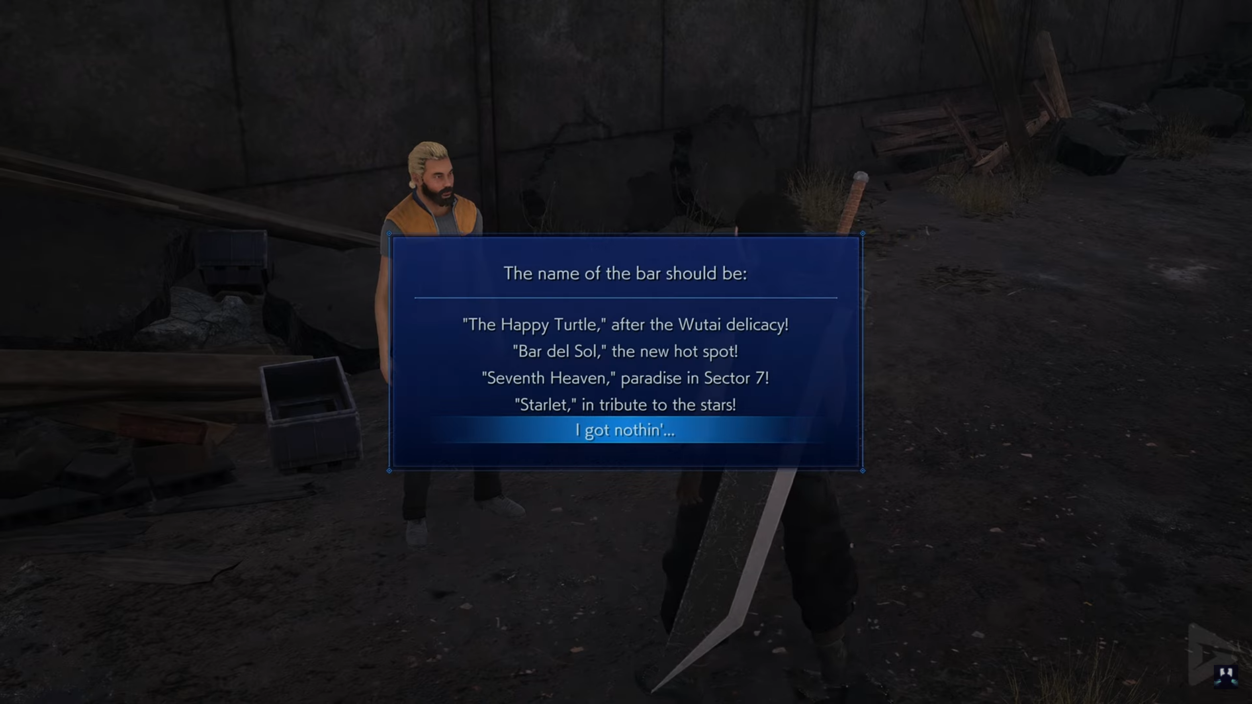 Кстаті, тут можна поговорити з людиною з нетрів, яка має анти-шинрінські погляди і яка хоче створити бар в 7 секторі, а точніше майбутнє Сьоме небо.
