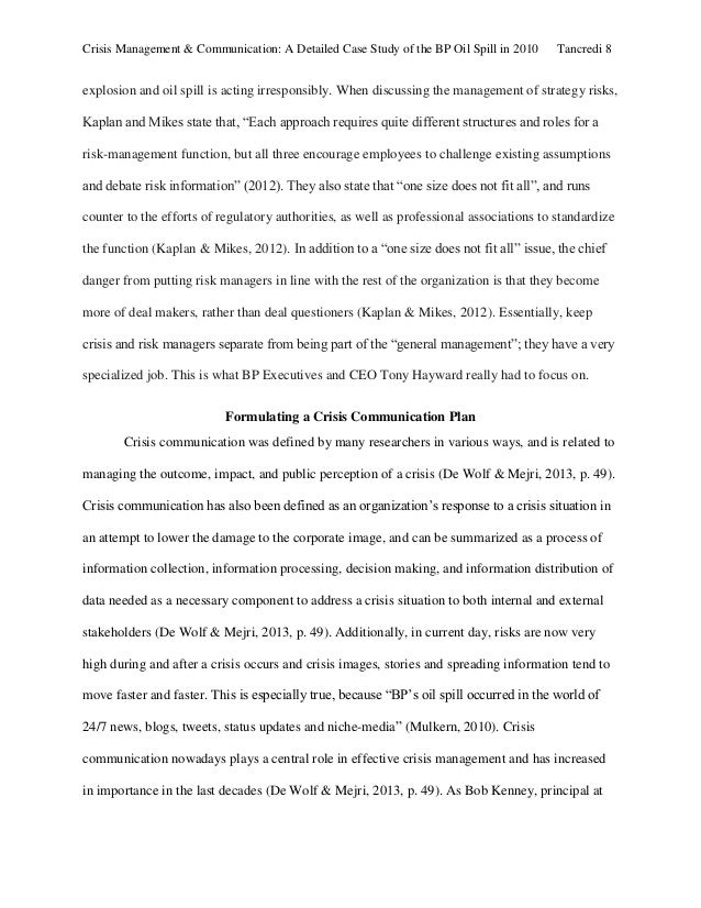 Crisis management ; BP 2129 Words | 9 Pages . Introduction When an organization is in a crisis , it dominates the organization's agenda and requires immediate action . The way the organization responds to a crisis can differ in many ways . In this essay I would like to discuss the crisis of the British concern British Petroleum (BP) .