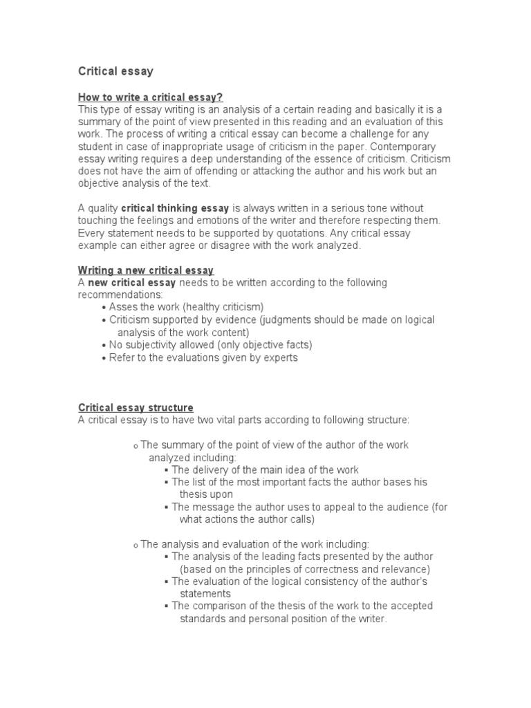 Literary Analysis Essay Example (PDF) Critical Analysis Essay . A critical analysis essay is an analytical essay that requires a writer to form an argument on a selected piece of writing, art, or a movie . This essay type aims to understand the creator's argument and form a claim over it . The critical essay demands a writer to critically . . .