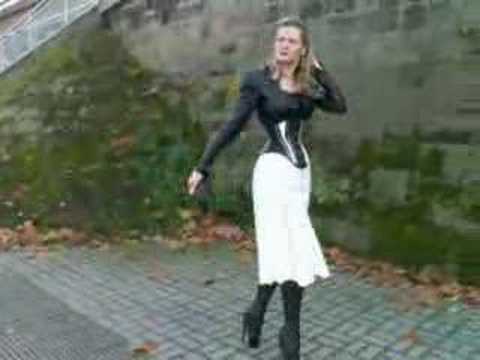 Public outdoor walk in white leggings and black boots .