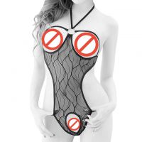Skinny brunette with fishnet stockings play with dildo