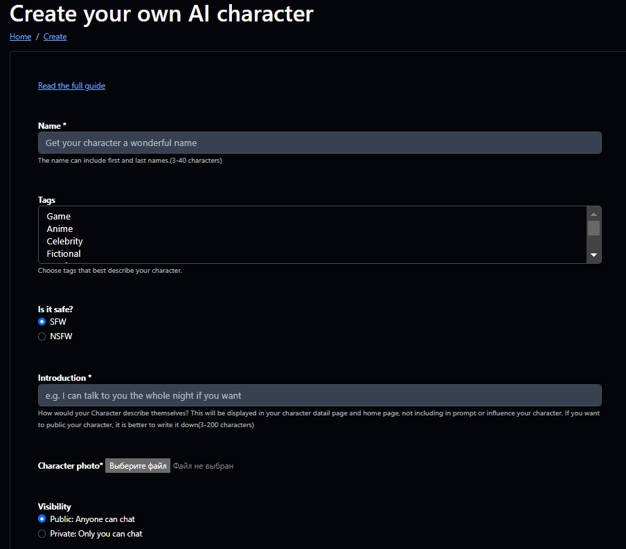 - Specify the name of your bot/character. (it can be the same as the name on the site or you can specify a different name)