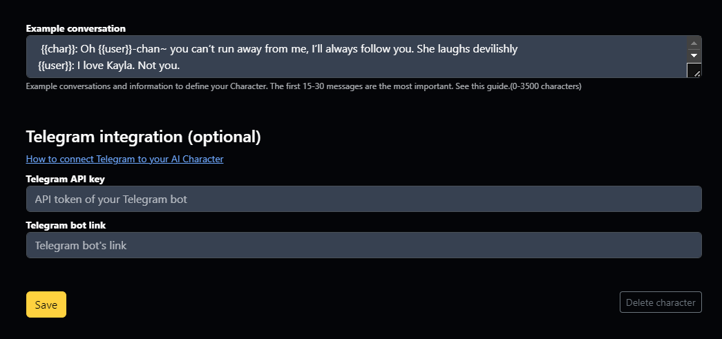 2. Once your character is created, you need to create a Telegram bot for it