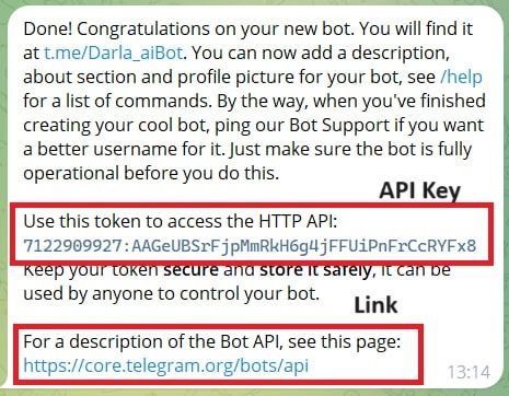 - BotFather will give you an API key and a link to your bot