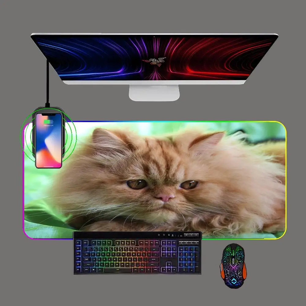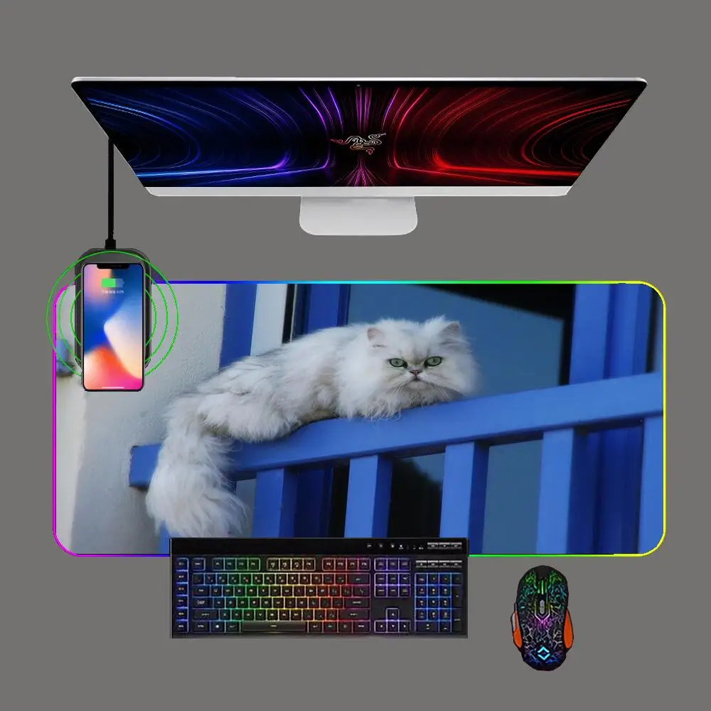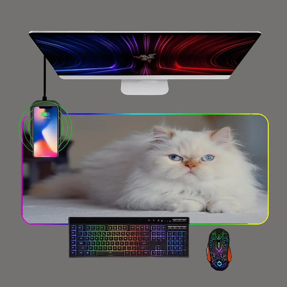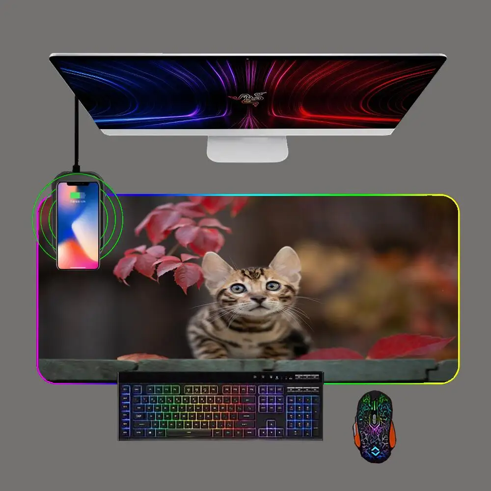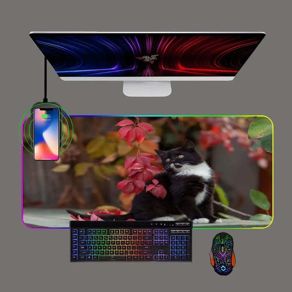 Cute Kitten Gaming Mouse Pad RGB Phone Wireless Charging with Backlit Pc Keyboard Pads Gamer Computer Rubber Mousepad Table Mat - Купить с бесплатной доставкой