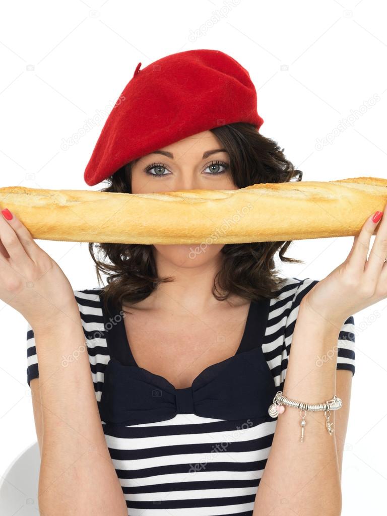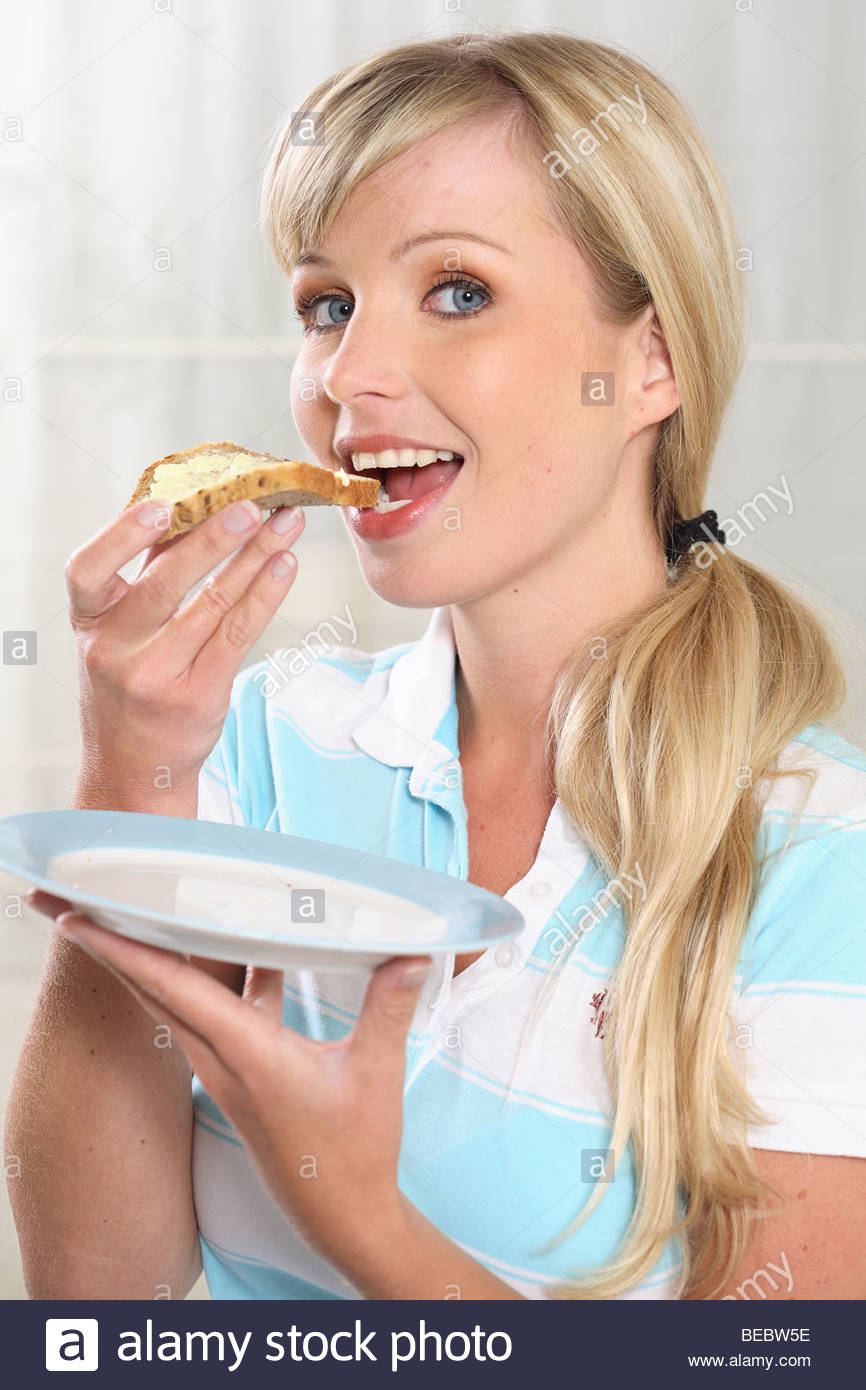 Cute blonde chewing bread with stuff photos