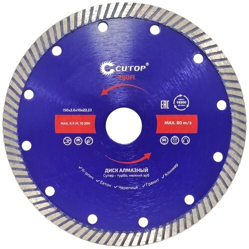 Takım çeliğinden yapılmıştır. Kesici kenar, yüksek kaliteli sentetik elmaslardan yapılmış toz içerir. Turboşarjlı yüzey, işleme sırasında kesme ürünlerinin etkili bir şekilde dışarı atılmasını sağlar. Delik çapı 22,2 mm. Kuru kesim için kullanılır: betonarme, granit, tuğla, taş ve diğer yapı malzemeleri. Profesyonel kullanım için tasarlanmıştır. Üretici - CUTOP, Barkod - 4660064460613, Kod - 65-15026, Standart boyut - 150x2.6x10x22.2 mm, Uzunluk - 230mm, Genişlik - 205mm, Yükseklik - 5mm, Brüt ağırlık - 240g