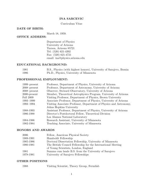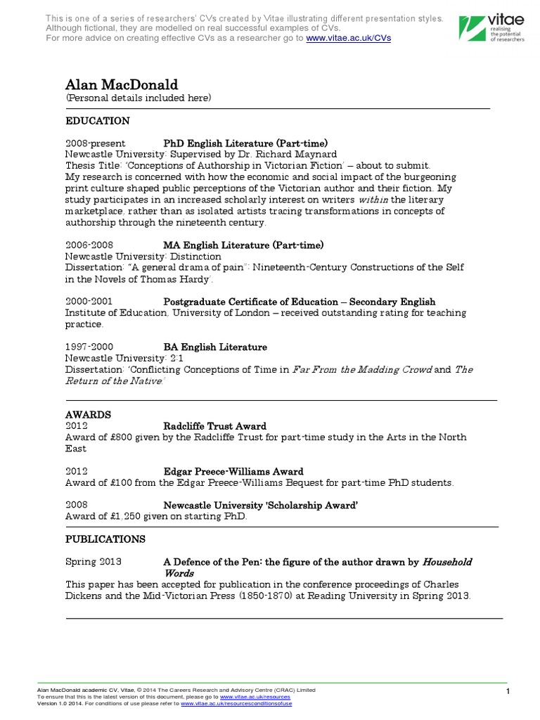 The curriculum vitae, also known as a CV or vita, is a comprehensive statement of your educational background, teaching, and research experience . . . . Thesis title and advisor, if applicable . . . . their publication records, construction of literary identity, and relationship with modernism .