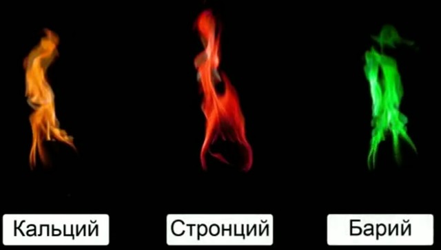 Соли кальция окрашивают пламя в кирпичнокрасный цвет, соли стронция—в карминово-красный цвет и соли бария—в желтовато-зеленый цвет .