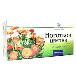 Эффективны и сборы с календулой . Сбор №1 Смешивают в одинаковых пропорциях сухие измельченные цветки календулы, цветки ромашки аптечной, траву зверобоя продырявленного, траву тысячелистника и листья брусники . Одну столовую ложку сбора заливают одним стаканом кипятка, настаивают полчаса и процеживают .