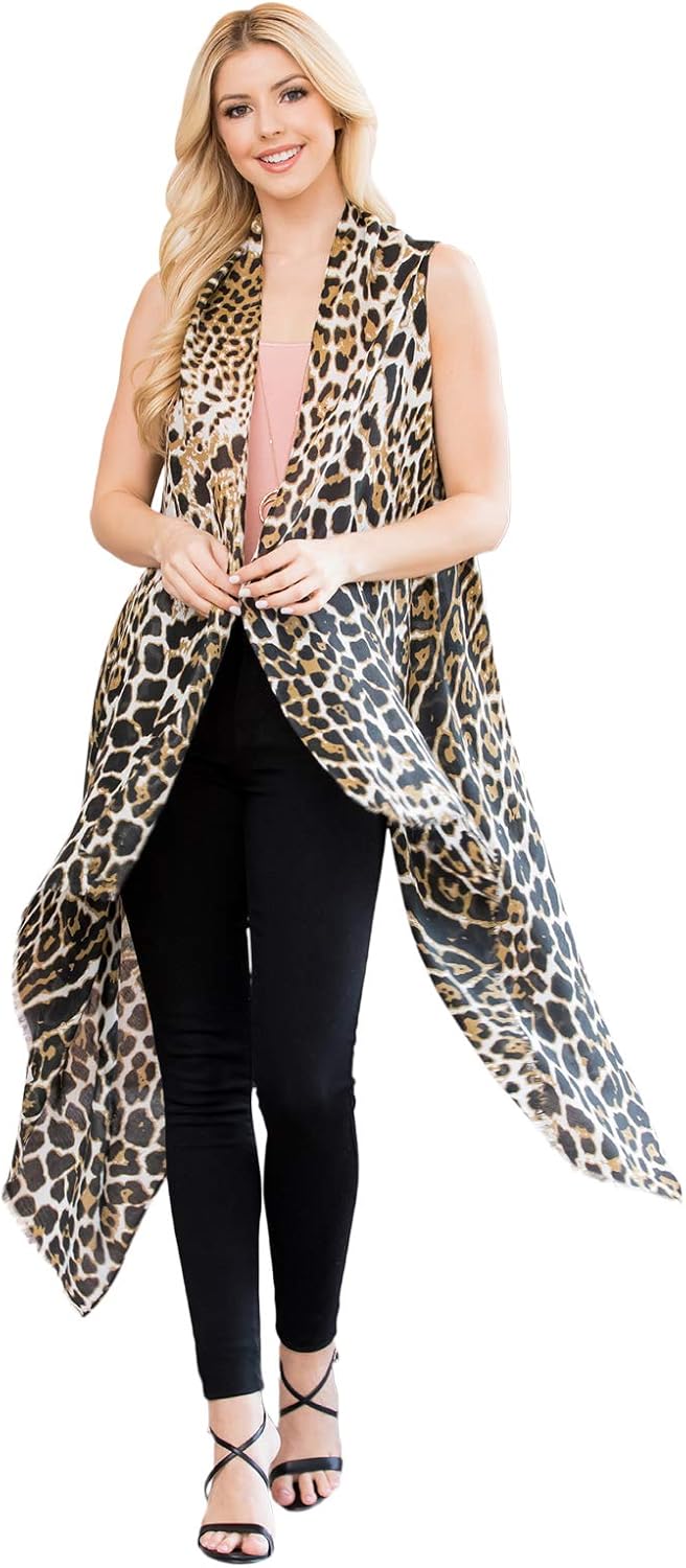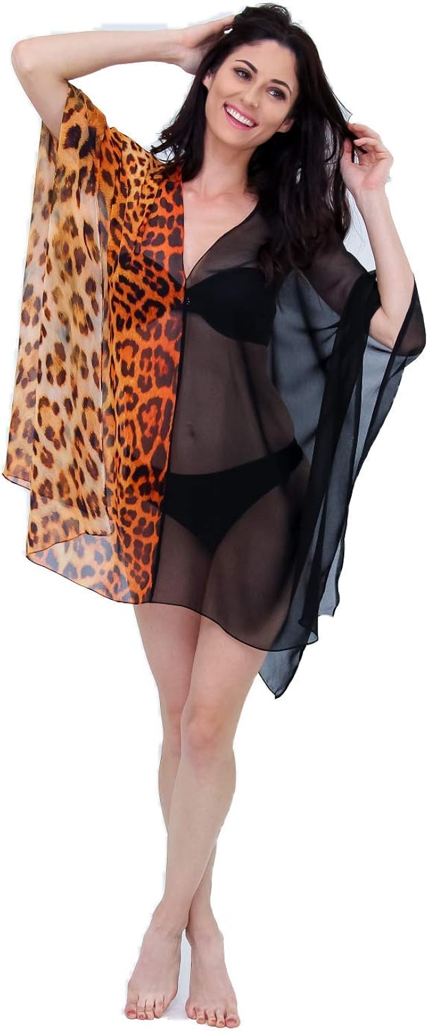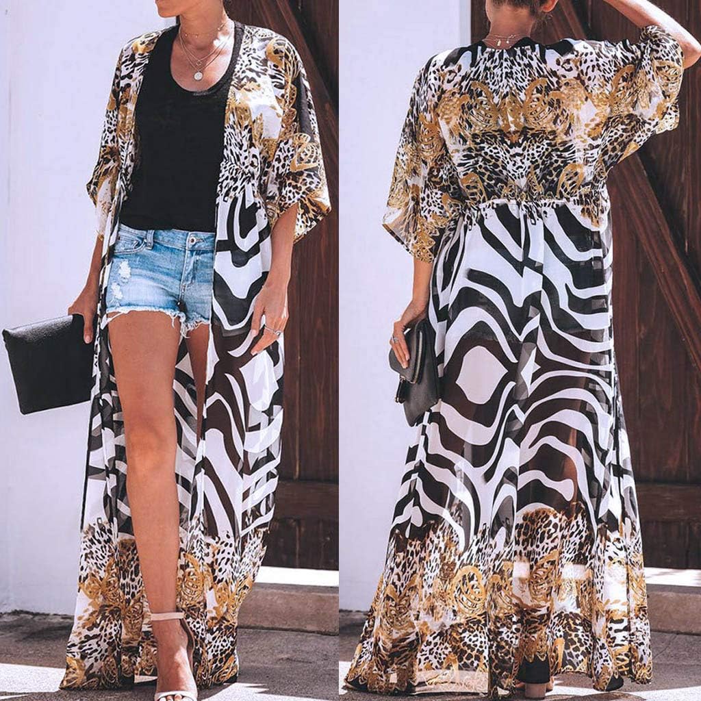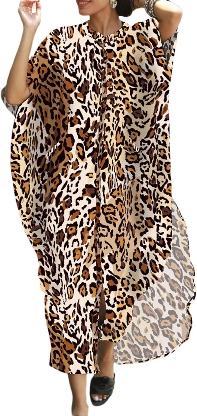 D0UD Women Button Up Kaftan Cardigan Zebra Striped Leopard Print Long Beach Dress Sunscreen Swimsuit Cover Up with Pockets