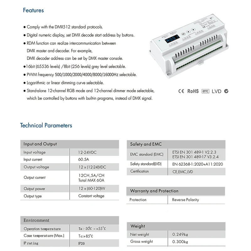 EzuyXdZVICHere you can buy D12 Din Rail 12 Channel DMX512 Decoder Constant Voltage with Display 12CH CV PWM Decoder for Setting DMX Address 12V 24V DC with free delivery to your post office.