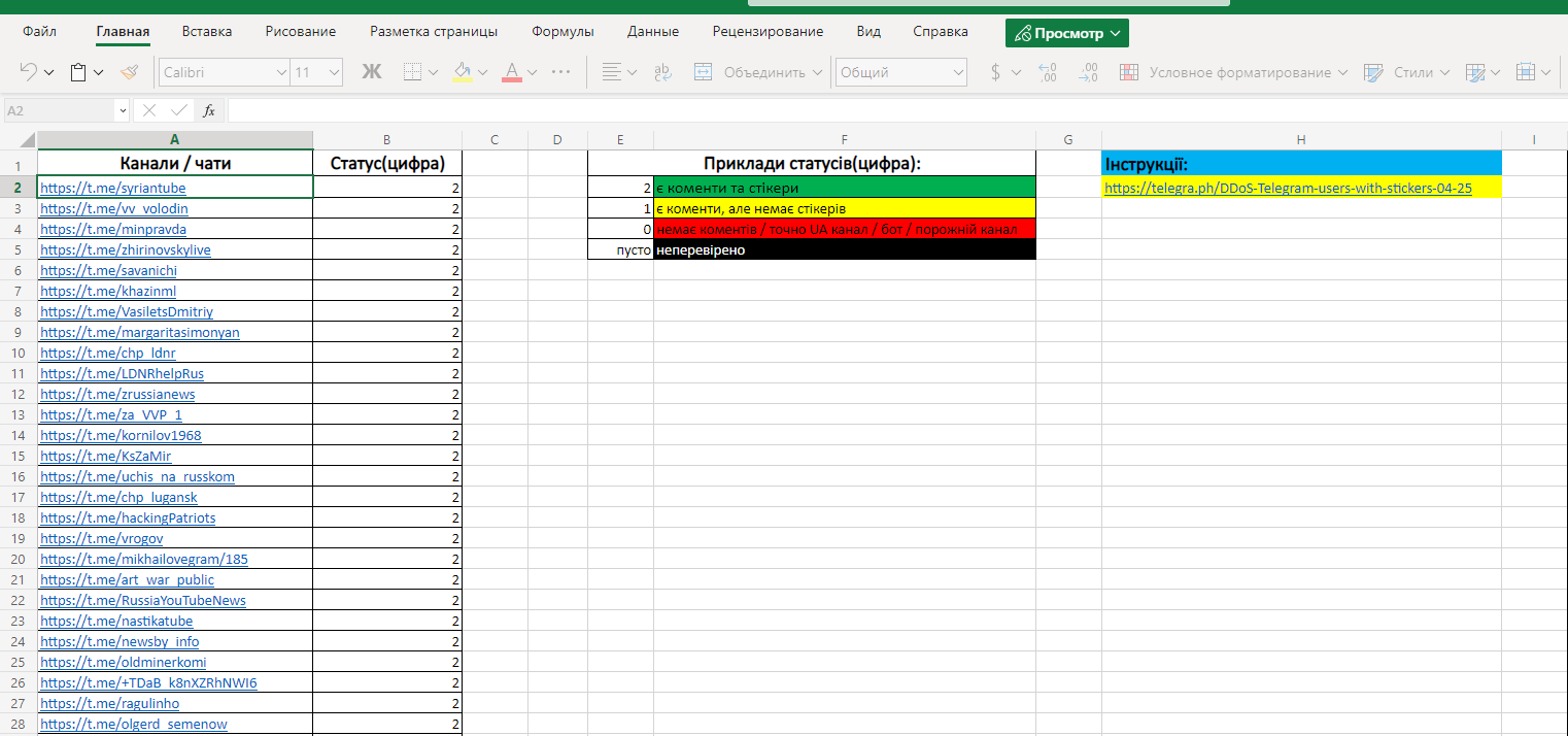 Йдемо за цим посиланням, де буде знаходитись увесь актуальний список каналів для рейду(наразі зібрано ~3000 каналів, з яких перевірено ~1000): https://1drv.ms/x/s!AtOz9RhdRP7mhBrF7fDO4zWvVVsU