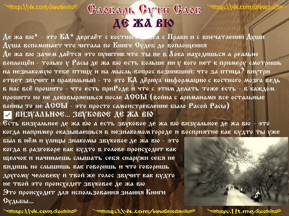 Де жа вю зачем даётся… это «пунктик» что ты не в Лока находишься а реально воплощён – только у Расы де жа вю есть… больше ни у кого нет… к примеру смотришь на незнакомую тебе птицу и на мысль-вопрос возникший: «что за птица?» внутри ответ звучит и правильный – то это КА «дёрнул» информацию с костного мозга… ведь в нас всё прошито – что есть приРоде и что с этим делать тоже есть – в каждом прошито… но не доковыряешься после АССЫ (война с ариманами… все остальные войны то не АССЫ – это просто самоистребление было Расой Расы)… (повтор информации со Словаря Сути Слов книга вторая – прим.сост)...