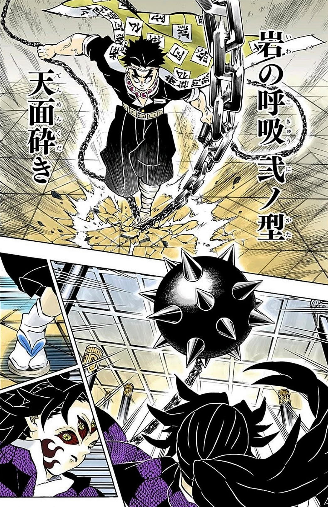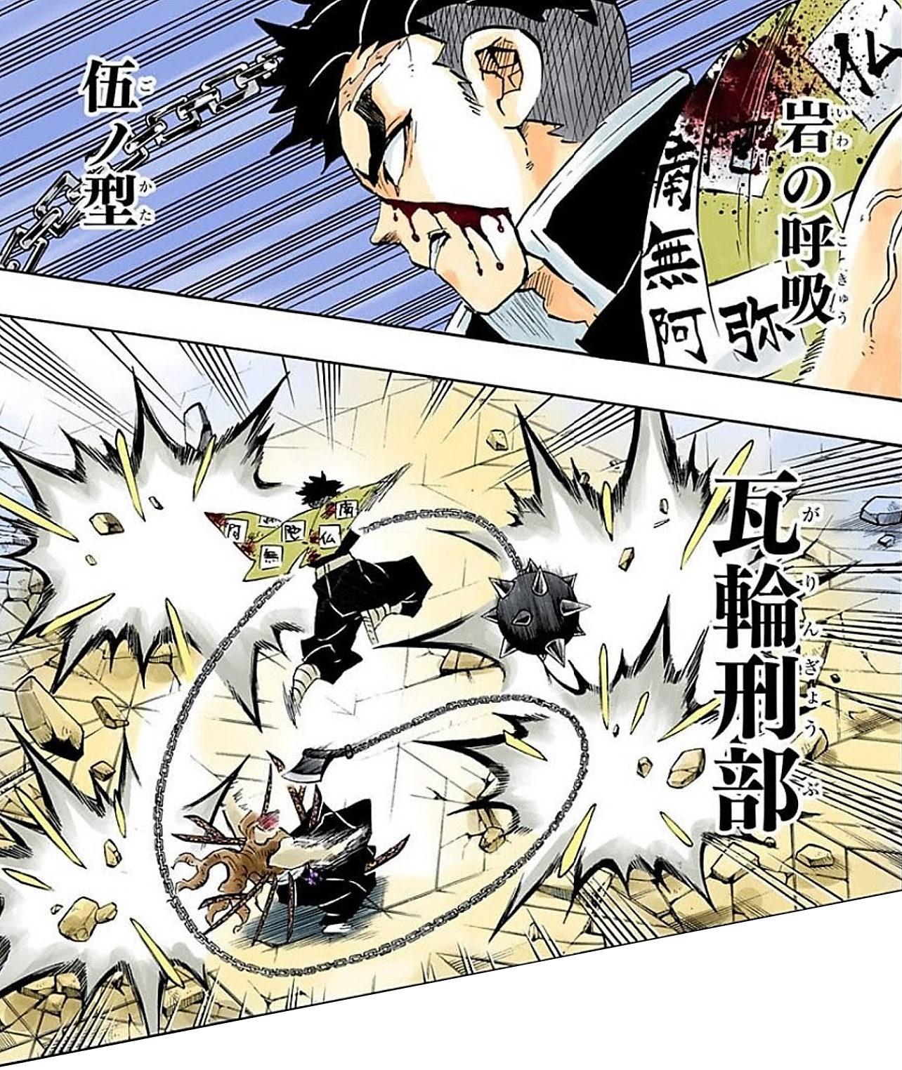 Stone Breathing (岩いわの呼こ吸きゅう, Iwa no kokyū?) is one of the five main Breathing Styles derived from Sun Breathing. Stone Breathing is a Breathing Style that mimics earth and stone and replicates it with the user's movements, techniques and abilities. Most, if not all, known techniques and forms utilize the ground beneath the user and the vast surroundings to generate powerful and sturdy attacks that specialize in both offense and defense. The Breathing Style was originally created by one of Yoriichi Tsugikuni's students who attempted to learn Sun Breathing, but, due them to not being as innately powerful as Yoriichi, they were unable to master it and was instead taught an alternative personalized Breathing Style by their teacher that focused specifically on their strengths and weaknesses, eventually branching out completely and becoming Stone Breathing.