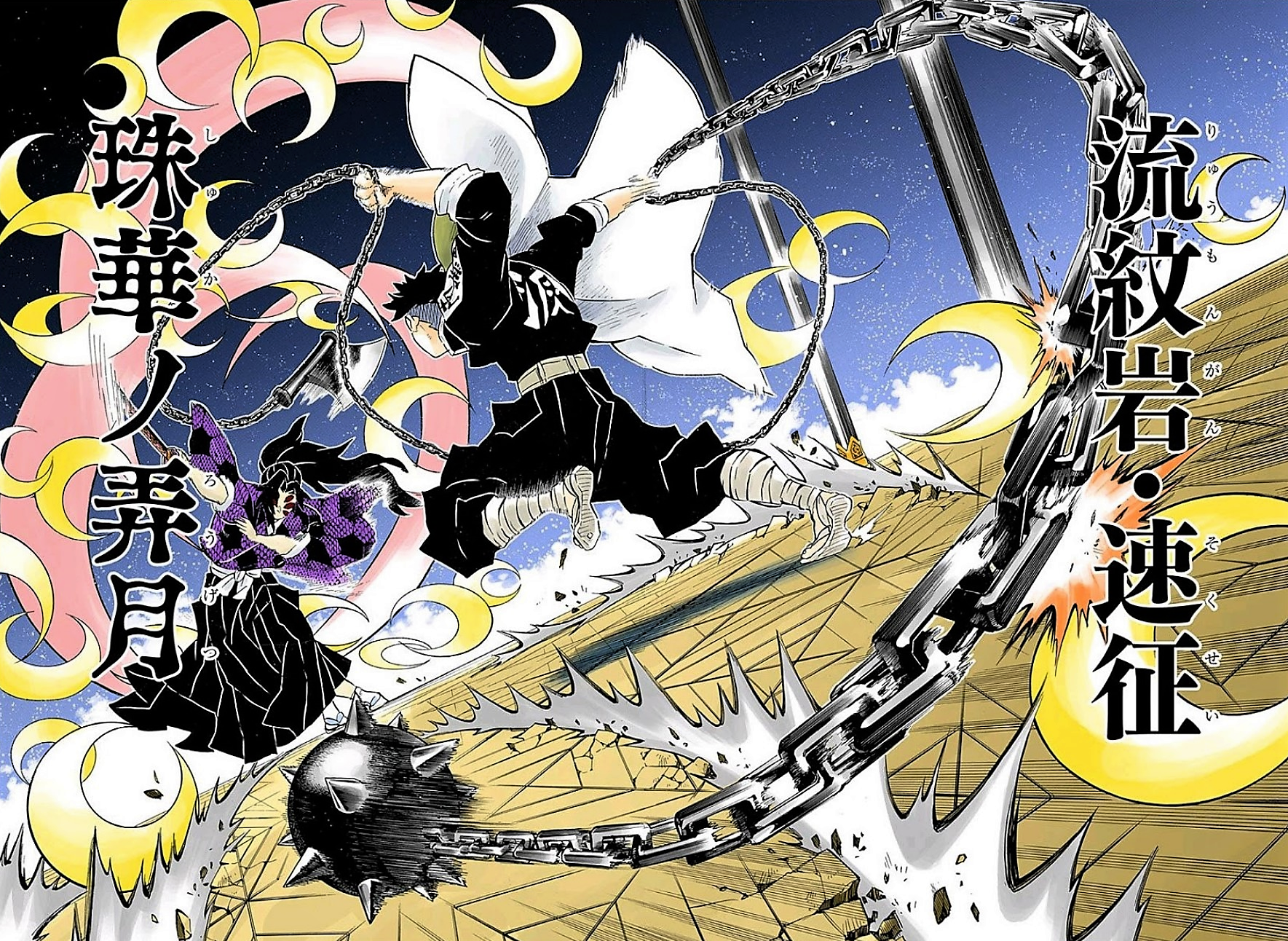 ➤Fourth Form: Volcanic Rock, Rapid Conquest (Shi no kata: Ryūmongan - Sokusei) - The user manipulates both the flail and axe weapons at both ends of the chain by swinging the chain on both sides in order to strike his opponents using a two pronged wide ranged attack.