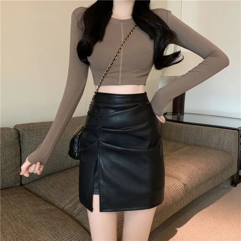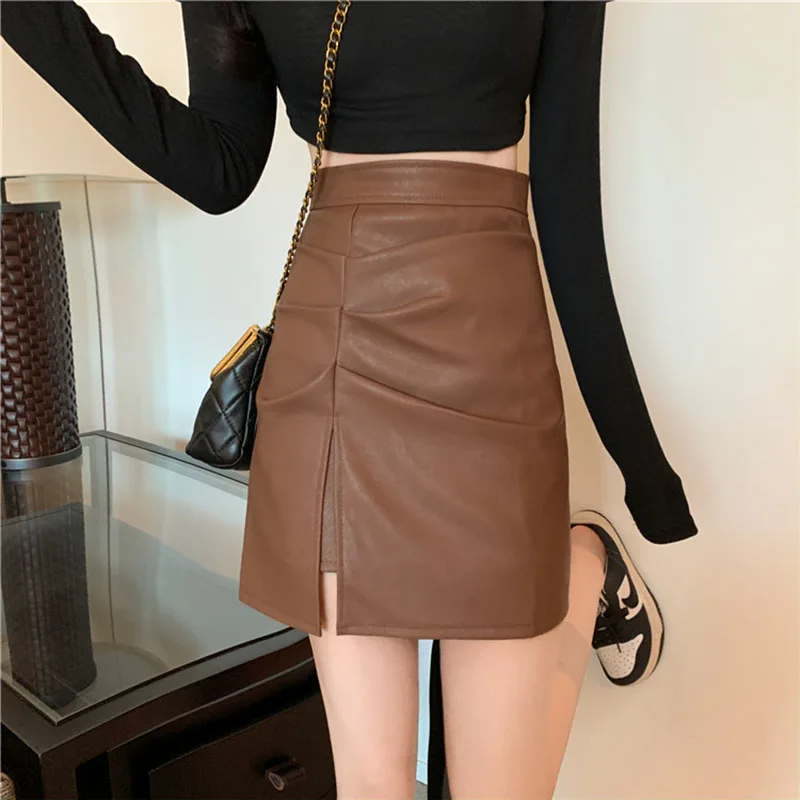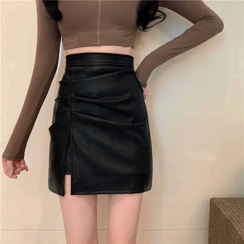 "DFRCAEG 2022 Spring Leather Skirt Women High Waist Folds Side Slit Short Skirts With Lining Korean Style Streetwear Mini Faldas" * Buy Now Just For 14$