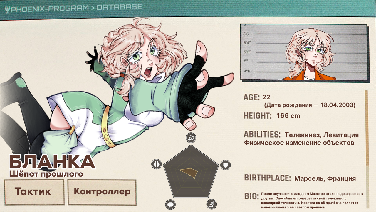 ТАКТИЧЕСКАЯ ПЕРЕСТРОЙКА — Если Бланка успешно завершает вызов, в следующий вызов она телекинетически "закрепляет" потенциального участника команды на слот, предоставляя команде наибольшую вероятность к успеху и +2 к характеристикам.