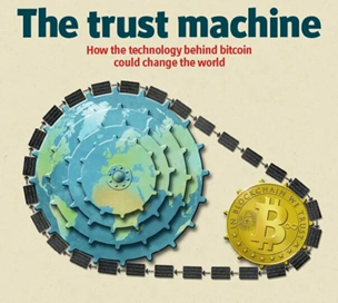 Переучет мирового богатства за 1000 лет (отсчет ведется от Единого государства Чингисхана) произведен и записан кодом блокчейн. Картинка 2015 г. журнала Экономист с велосипедной цепью от ступицы в золоте к четырем звездочкам мировых трастов. (in blockchain we trust).