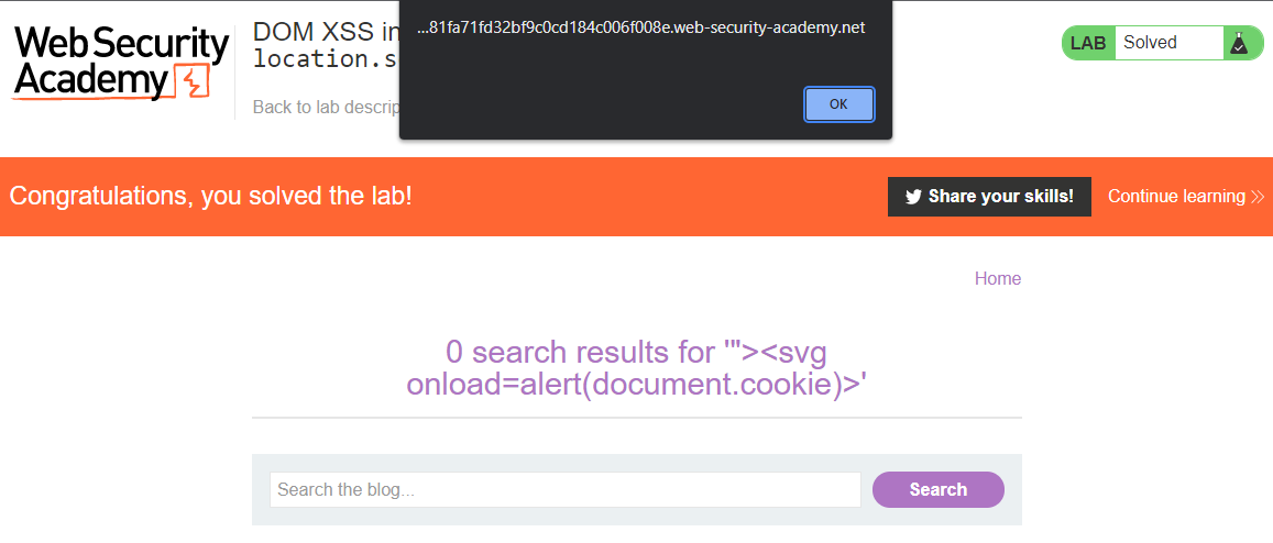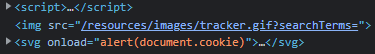 If we explore the code one more time, we can see that our search populated and executed one more code section, that executed an alert when the browser rendered this element: