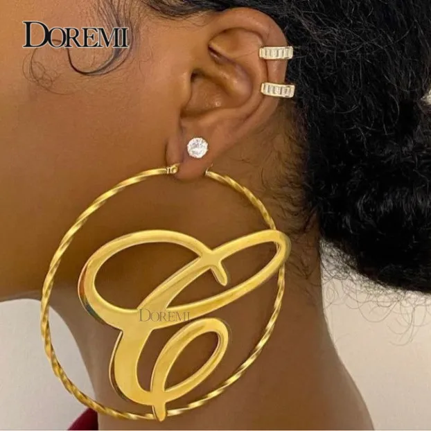 "DOREMI 75mm New Twisted Custom Name Earrings Personalized Initail Earrings Name Hoops Letter Earrings Hoop Custom Earrings Hoops" * Buy Now Just For 11$