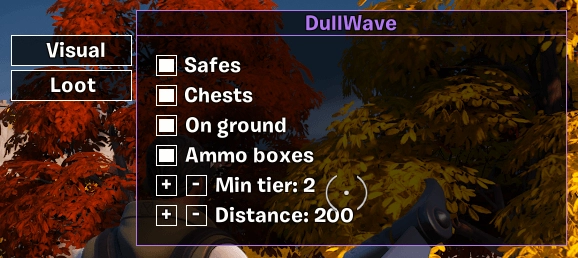 DULLWAVE FortniteVISUALSPlayerESPBox Style [Corner, 2D BOX]SkeletonFilledDistanceNickNameWeaponSkeletonDistanceCar ESPLamaPlatformLOOTSafesChestsOn groundAmmo boxesRarity sortDistance settings