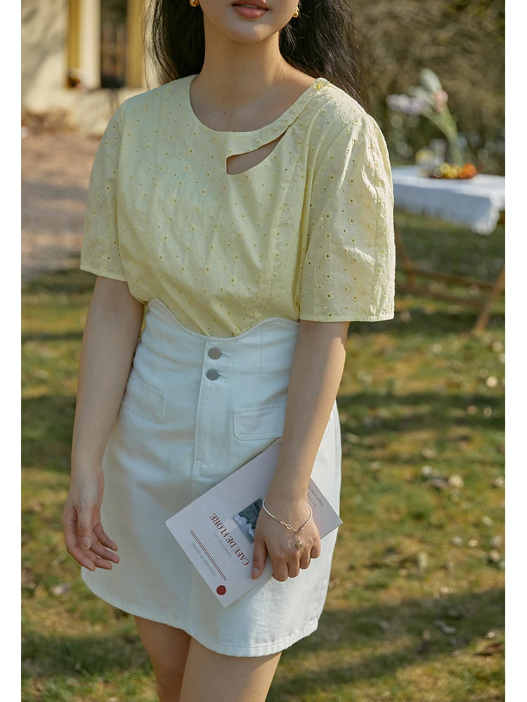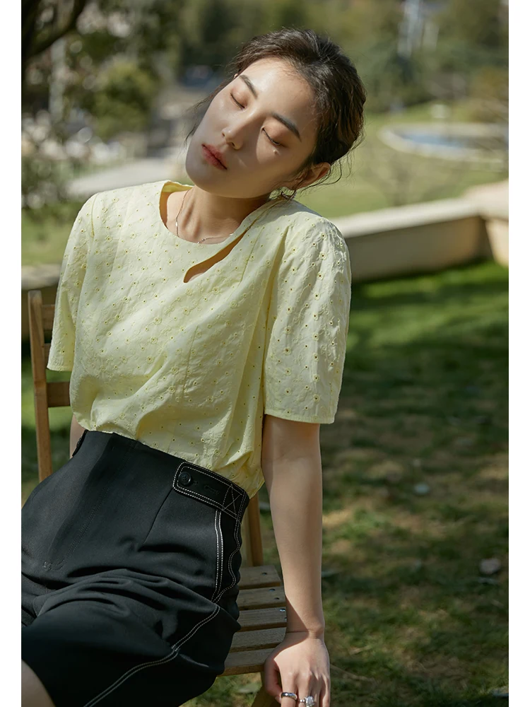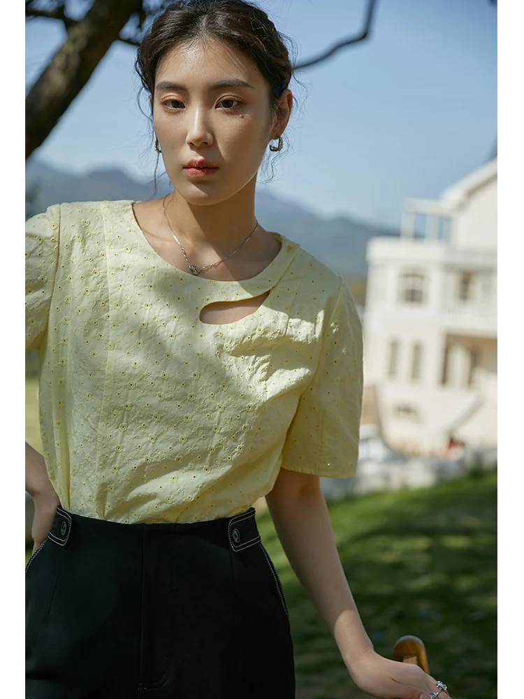 "DUSHU Cutout Embroidered Shirt Slightly Fat Lady Round Neck Short Sleeve Blouses Straight Loose Office Lady Solid Cotton Tops" * Buy Now Just For 35$