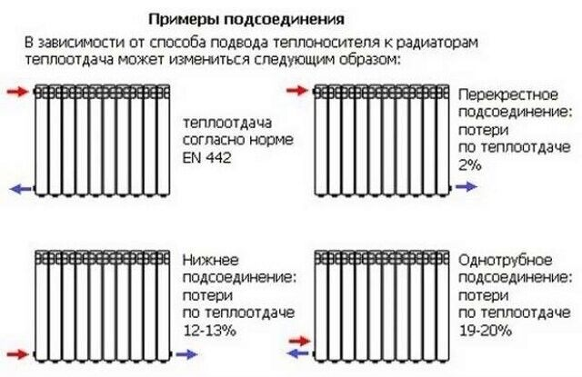 7 Батареи присоединяются к трубопроводу. Можно использовать боковой, диагональный или нижний метод подключения.